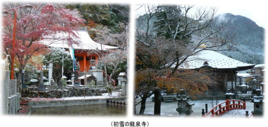 洞川温泉の初雪です。龍泉寺のお堂の屋根も真っ白。